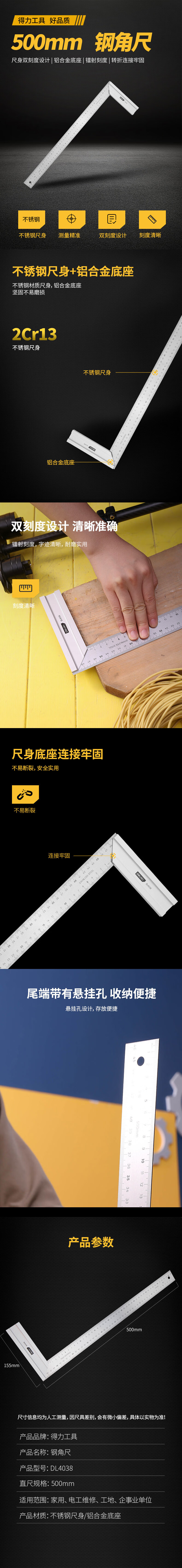 商品名稱:得力DL4038 鋼角尺 直角尺雙刻度角尺90度尺拐尺木工尺方直尺500mm