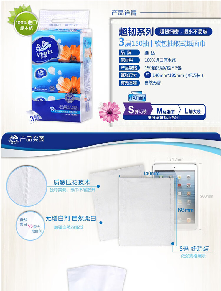 商品名稱:維達V2219 超韌3層抽取紙面巾150抽S碼 3包*16提 共48包 整箱