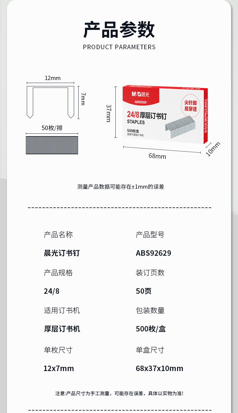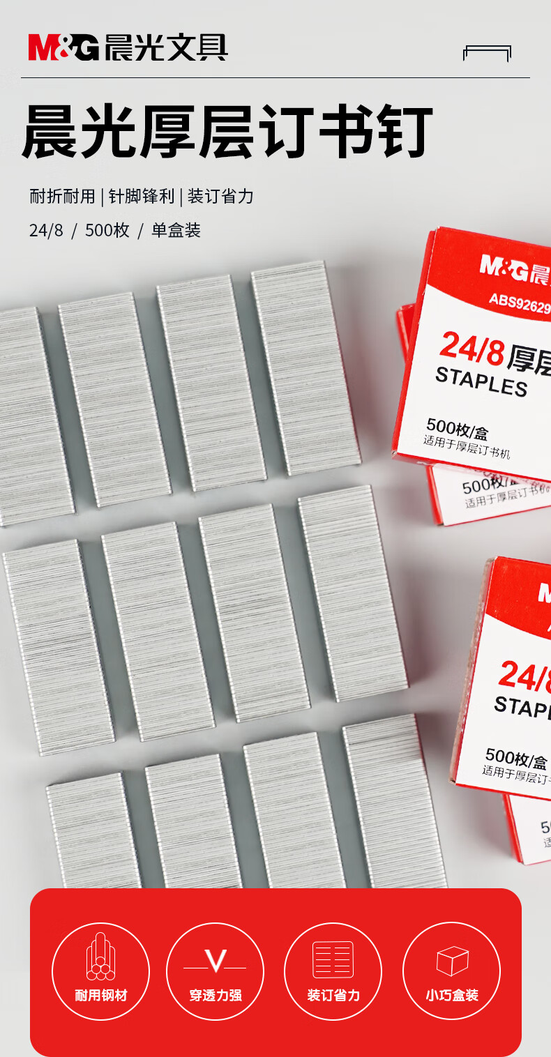商品名稱:晨光ABS92629 訂書釘 24/8號(hào)厚層易穿透訂書針 辦公用品 500枚/盒 單盒裝