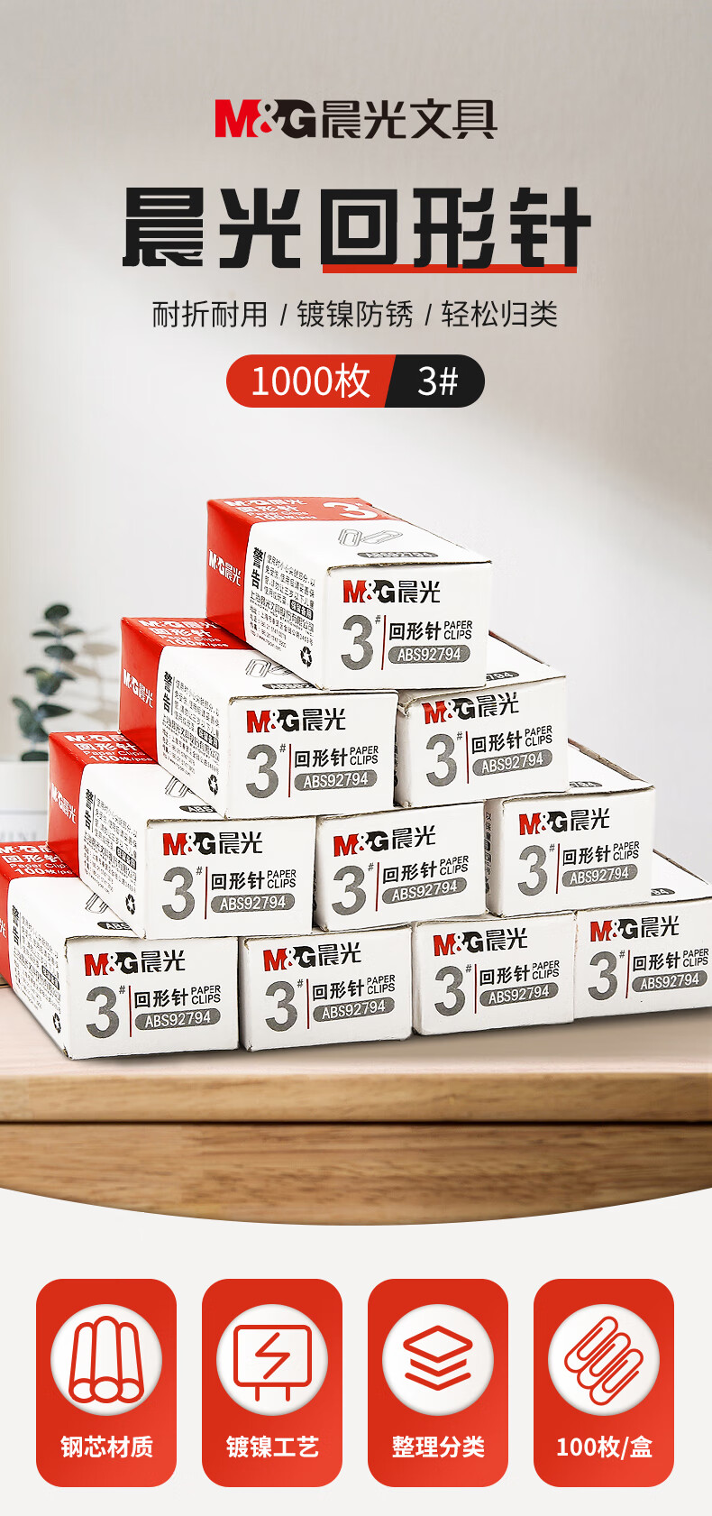 商品名稱:晨光ABS92794 鍍鎳回形針 3#金屬防銹曲別針 辦公用品 100枚/盒 10盒裝