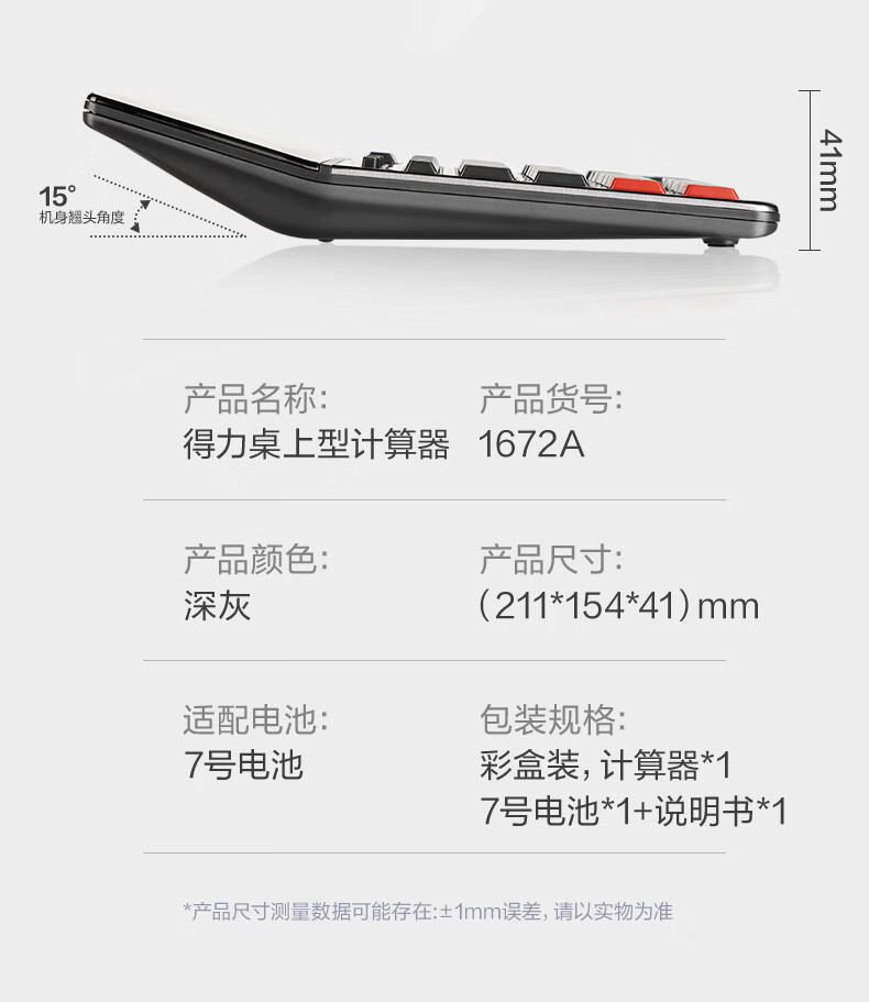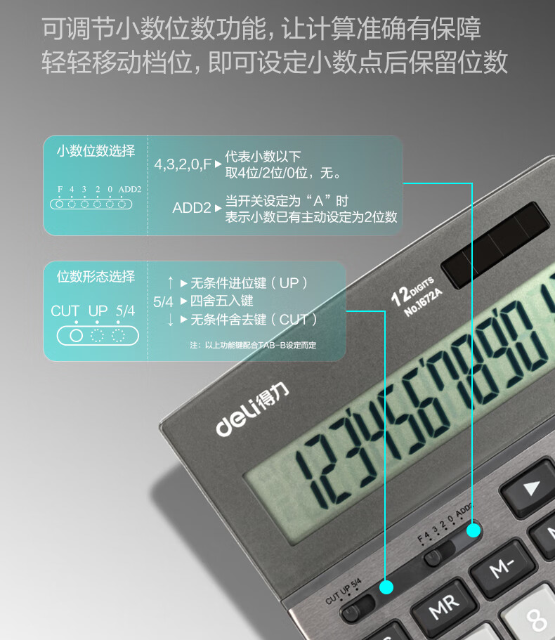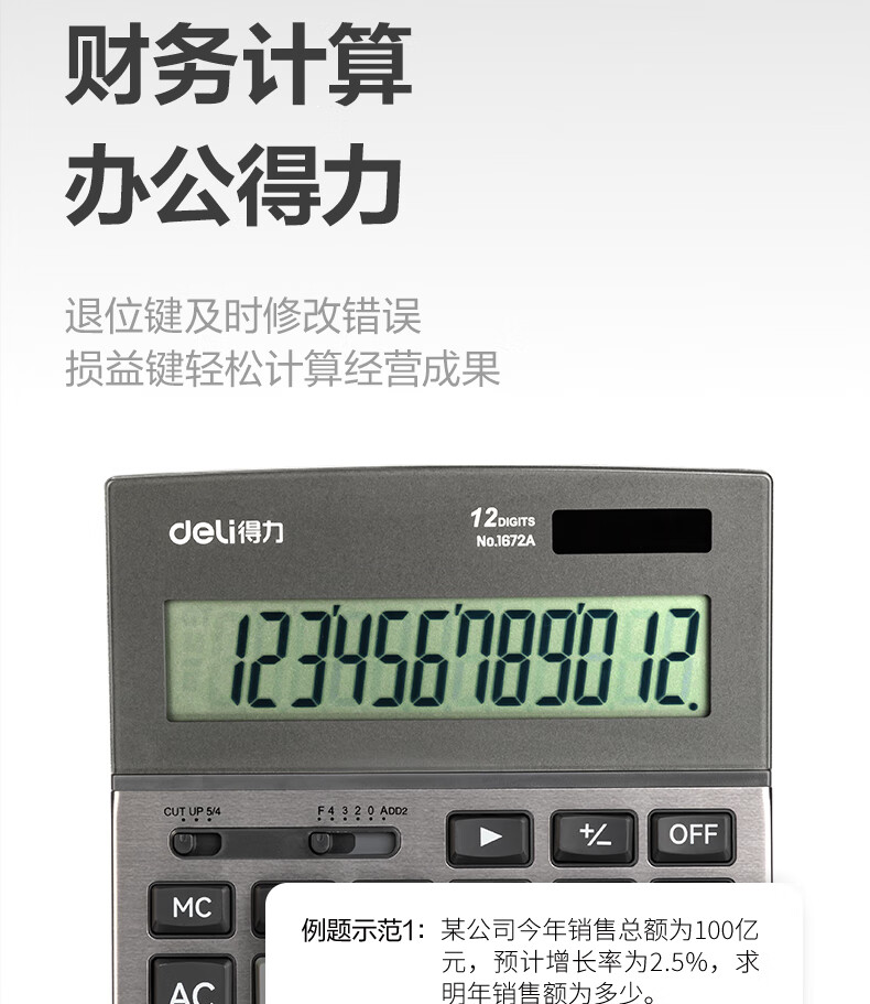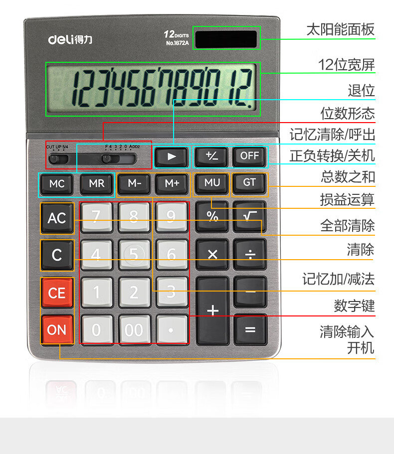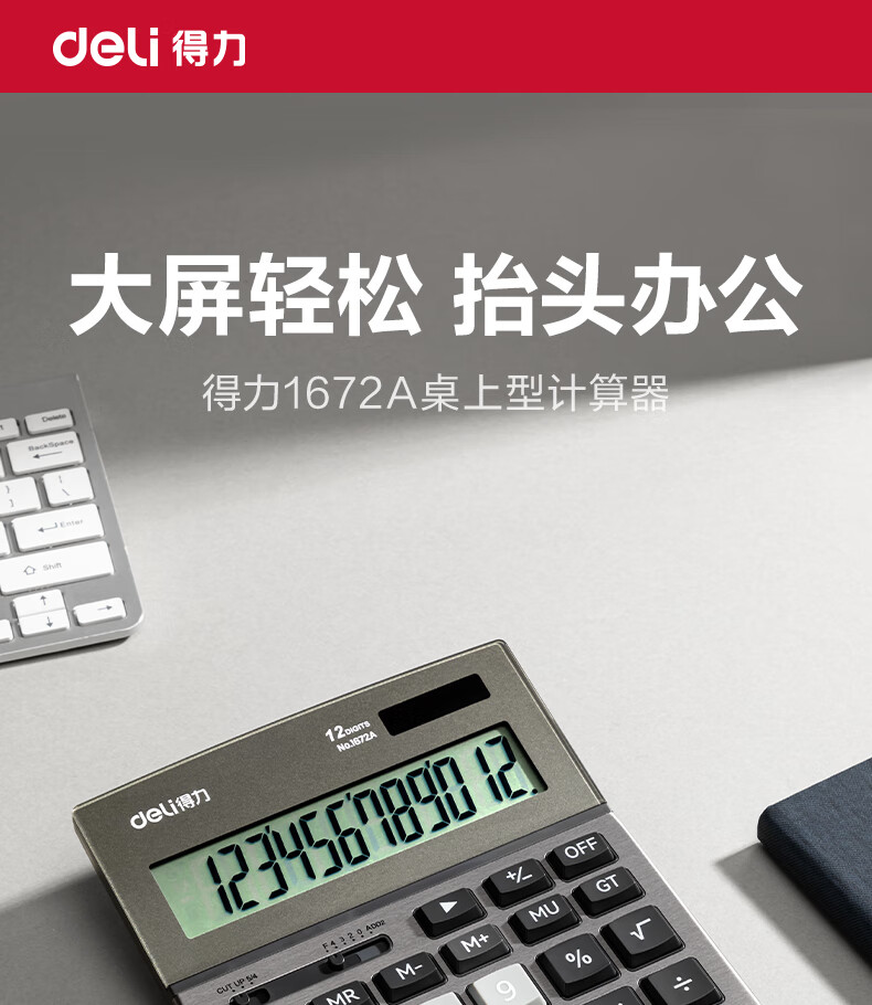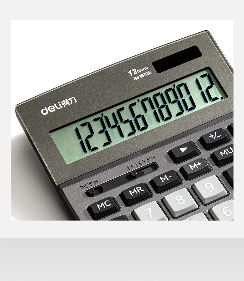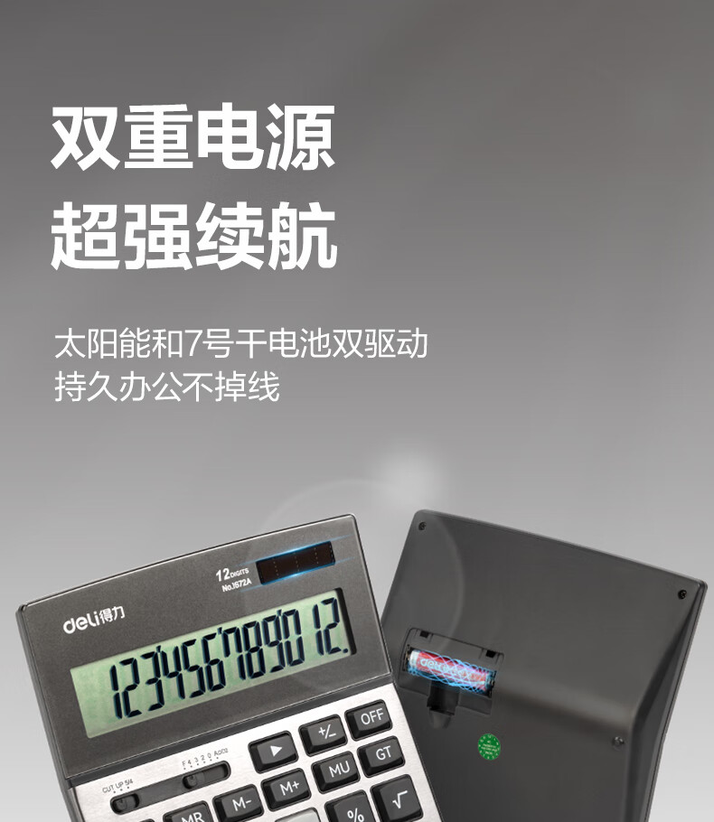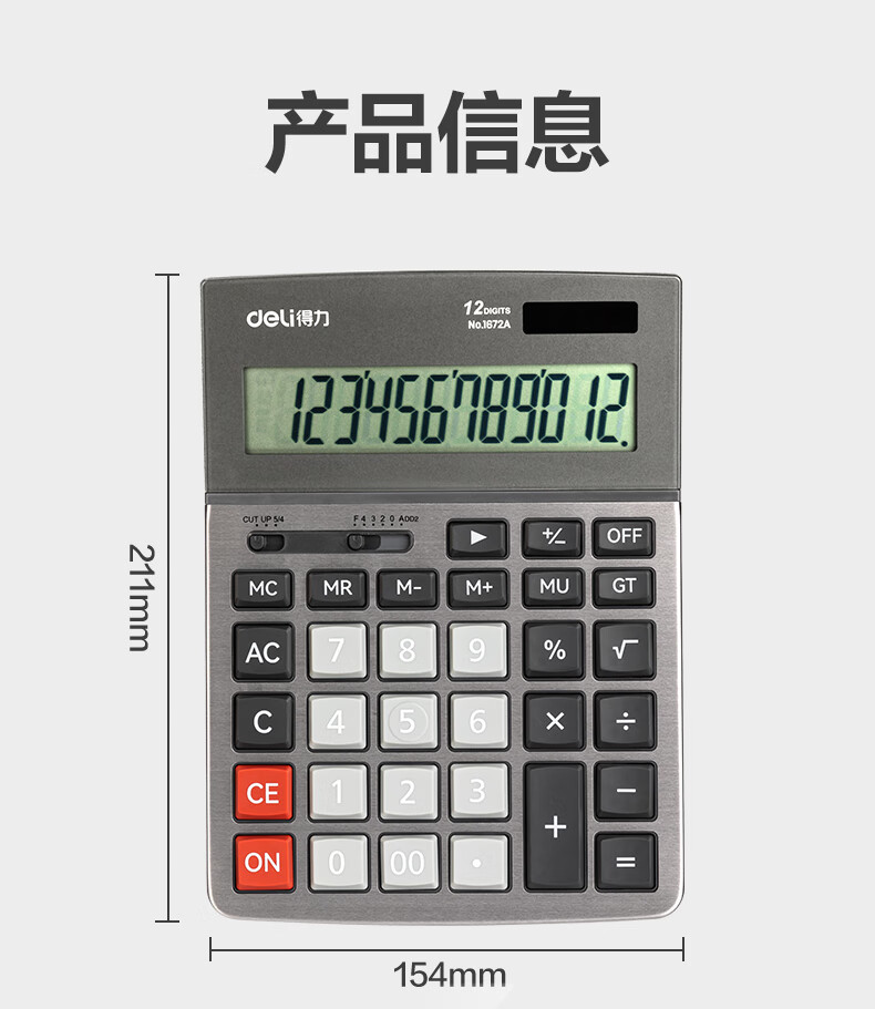 商品名稱:得力1672A 雙電源計(jì)算器 商務(wù)金屬面板12位大屏塑膠按鍵桌面計(jì)算機(jī) 單個(gè)裝