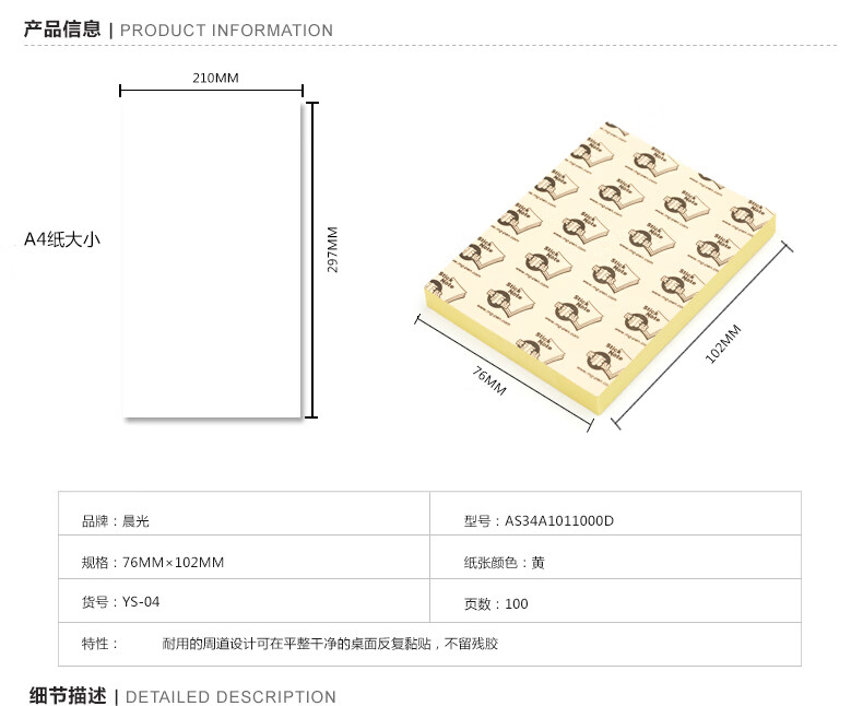 商品名稱:晨光YS-04 便利貼 3X4優(yōu)事貼 100頁自粘黃色留言貼便簽紙76X102mm 單位:本